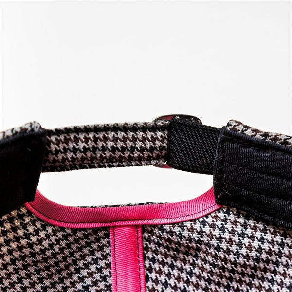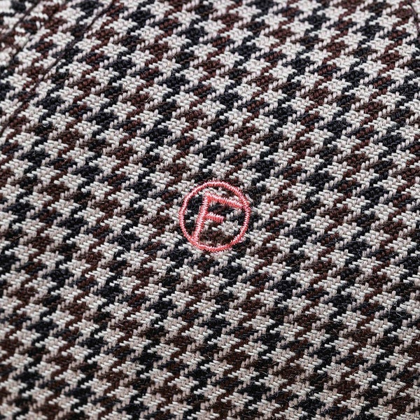 トラディショナルなチェック柄とクラシカルな生地の組み合わせでブリティッシュな雰囲気ながら、菊穴部分の刺繍と裏のテープをポップなカラーリングにし、遊び心を加えています。
