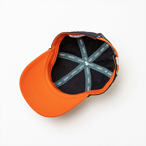 LACOSTE(ラコステ)定番の、フロントにワニワッペンを配したオーソドックスなコットンツイルのキャップですが、フレンチストリート感のある2トーンにしました。フロントだけでなくバックスタイルも2トーンになるように、アジャスターベルト部分にもアクセントカラーを入れています。
