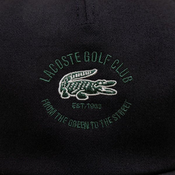 当時のラコステゴルフクラブをフィーチャしたクラシックなグラフィックが特徴的なコットンツイルのキャップです。