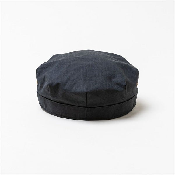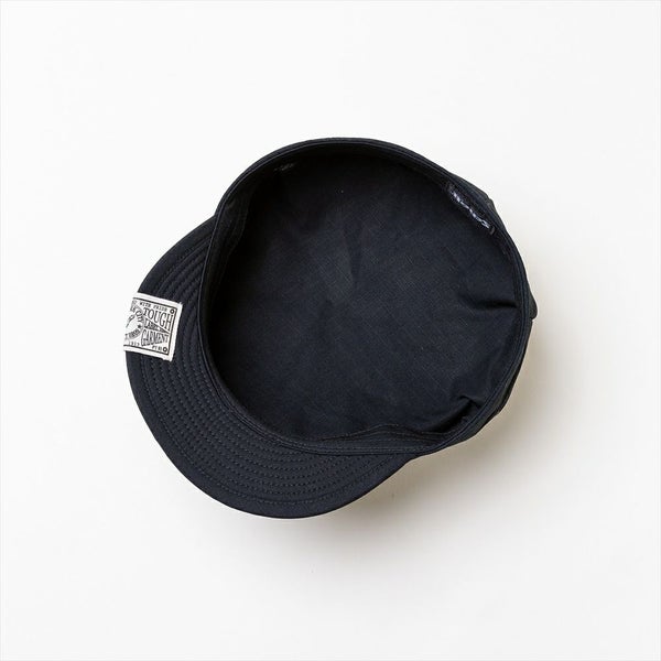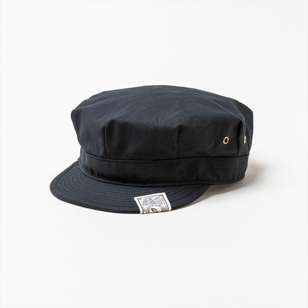 1枚の布の、前後左右をつまみ8角形に仕立てているレイルロードキャップはその名の通り、鉄道員用の製帽でした。当時は労働者達の制服とセットで作られ、古着や昔のアメリカの映画などでよく見られる形です。