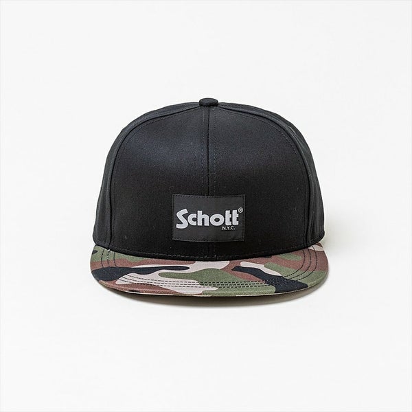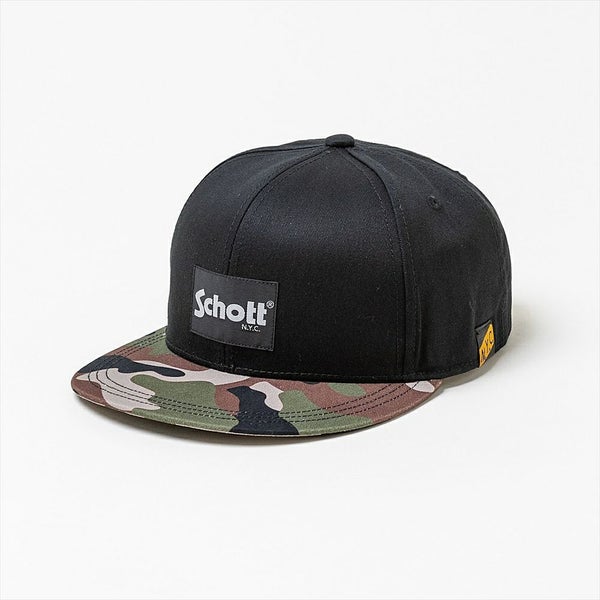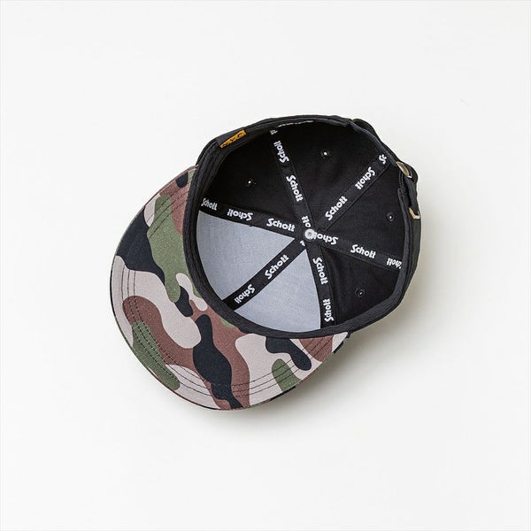 ブリムに使用しているカモフラージュ柄がアクセントになっている、Schott(ショット)のフラットバイザーキャップです。