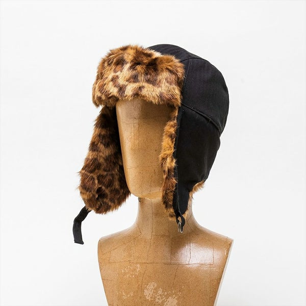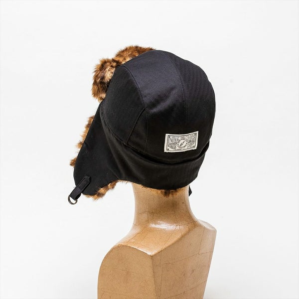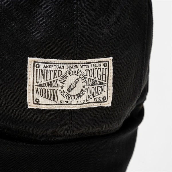 コットンヘリンボーンとフェイクファーを使用し、ヴィンテージ感のあるフライトキャップに仕上げました。耳当て部分を下ろすと、古着好きな方にはたまらないであろう、労働者の証として使用されていたユニオンチケットを模したSchott(ショット)オリジナルネームが付いています。