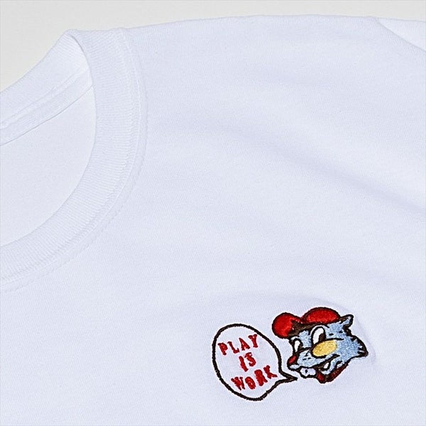 架空の野球チームをイメージしたマスコットの刺繍がフロントのワンポイントになっています。バックプリントはもちろん染み込みプリントなので、薄れていく経年変化を楽しめます。ボディは、6ozのオープンエンド糸を使用したアメリカンテイスト溢れる、ザックリとした素材感が特徴です。