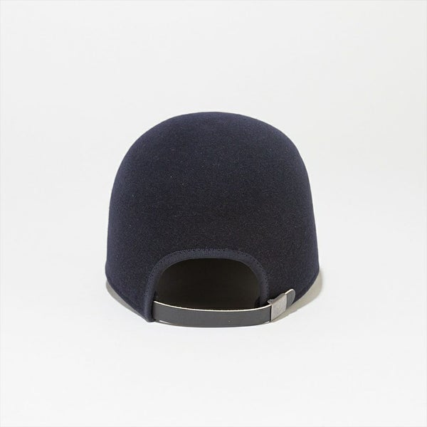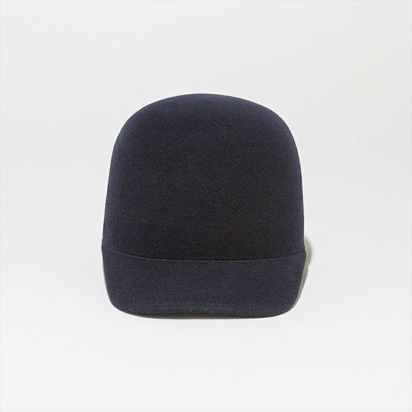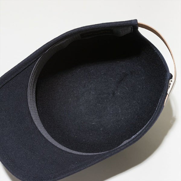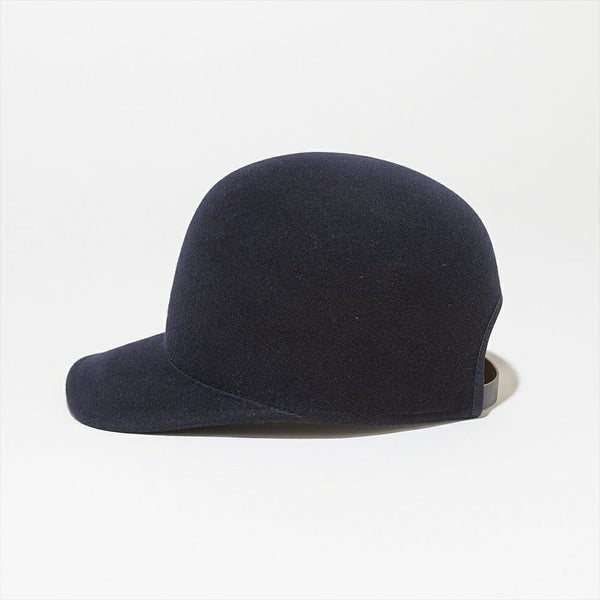フェルトハットをキャップにしました。材料には毛並みがキレイでキメ細かいポルトガルウールを使用し、ハットと同じ製法で作ることにより、縫製が無く通常のキャップでは出ないミニマルな上品さが有ります。また、若干クラウンを高くしアンニュイな雰囲気に仕上げています。
