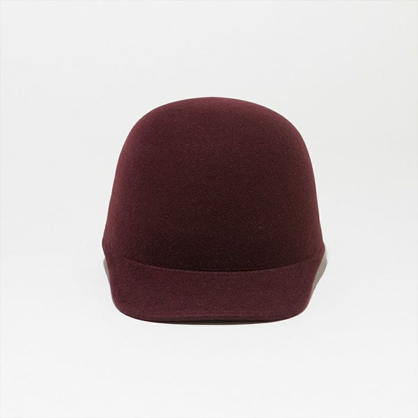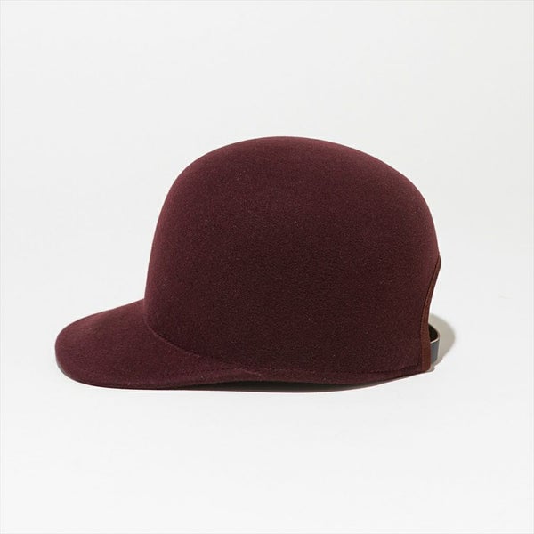 フェルトハットをキャップにしました。材料には毛並みがキレイでキメ細かいポルトガルウールを使用し、ハットと同じ製法で作ることにより、縫製が無く通常のキャップでは出ないミニマルな上品さが有ります。また、若干クラウンを高くしアンニュイな雰囲気に仕上げています。