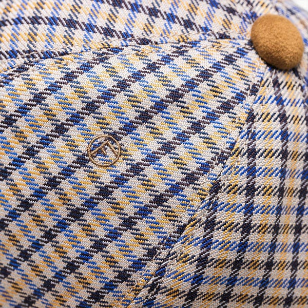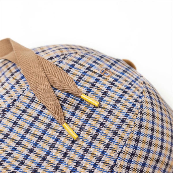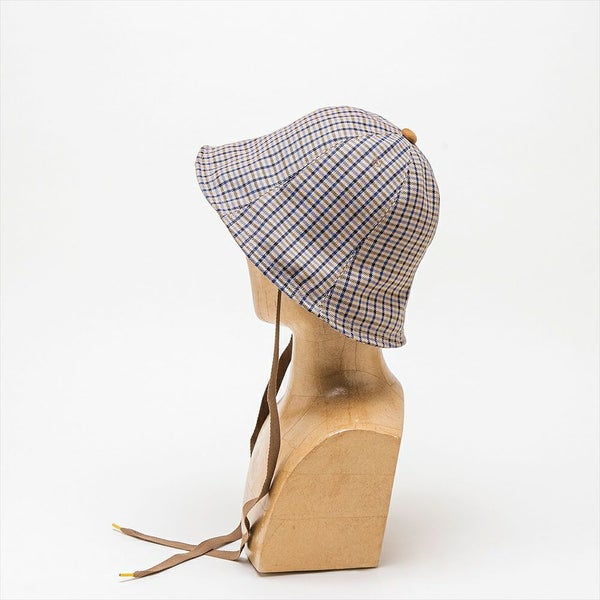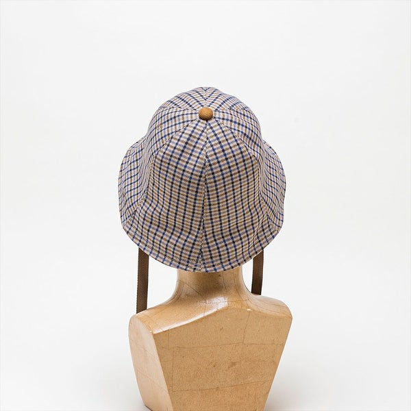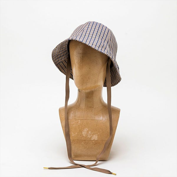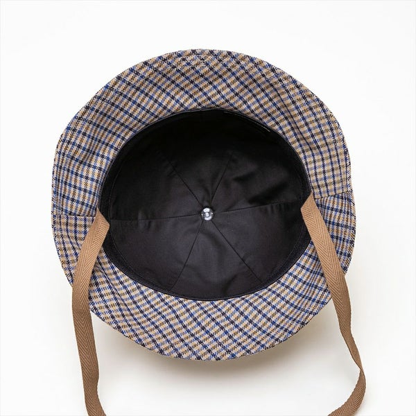 トラディショナルなチェック柄とクラシカルなへリンボンテープのあご紐で、ブリティッシュな雰囲気のある上品なチューリップハットに仕上がりました。もちろん、THE FACTORY MADE(ザファクトリーメイド)のアイコンの?刺繍と、シューレースをイメージしたチップ加工のあご紐で遊び心も忘れていません。