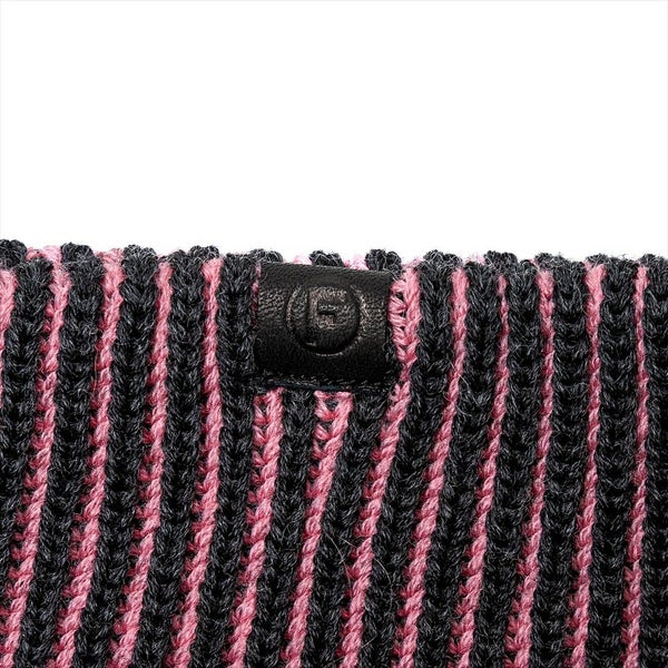 異なる二本の糸を、表面と裏面で分けて編む二重臼編みと呼ばれる手法を用い、裏面の糸色がアクセントになり見る角度により色合いが変化して見えます。