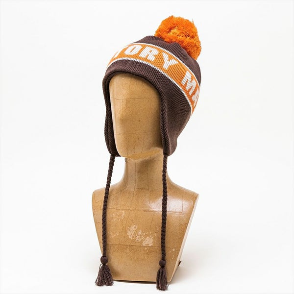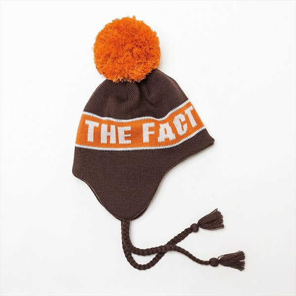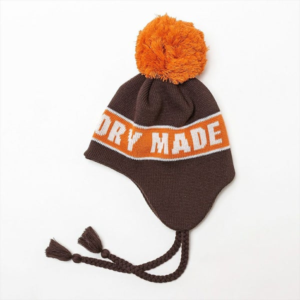 大きな耳当てが特徴のニットガイドは、冬のアイテムの定番のシルエットです。大きめのポンポンとフリンジ付きの三つ編みのあご紐で、レトロな雰囲気に仕上げています。また、ジャカード編みでTHE FACTORY MADE(ザファクトリーメイド)のロゴを表現しカレッジ風にデザインしました。