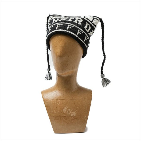 目を引くのは、ツノの様に飛び出たフリンジ付きのコード。スクエア型のシルエットは一般的な丸いシルエットのニット帽とは違い斬新で、コード部分がより際立つシルエットです。