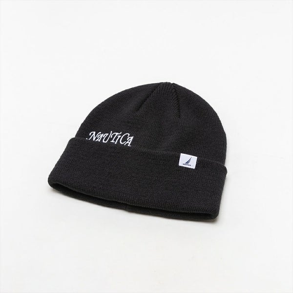 上品な飾り書体にしたNAUTICA(ノーティカ)のロゴをフロントに刺繍した、シンプルなニットワッチです。近年ブランドロゴはサンセリフ体のフォントが一般的なので、ひげのあるセリフ体のデザインは新鮮です。